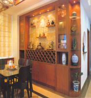 Thiết kế âm tường, kết hợp tủ trưng bày + tủ kín, bố trí rượu vang, rượu mạnh, ly pha lê tiện dụng và thẩm mỹ.