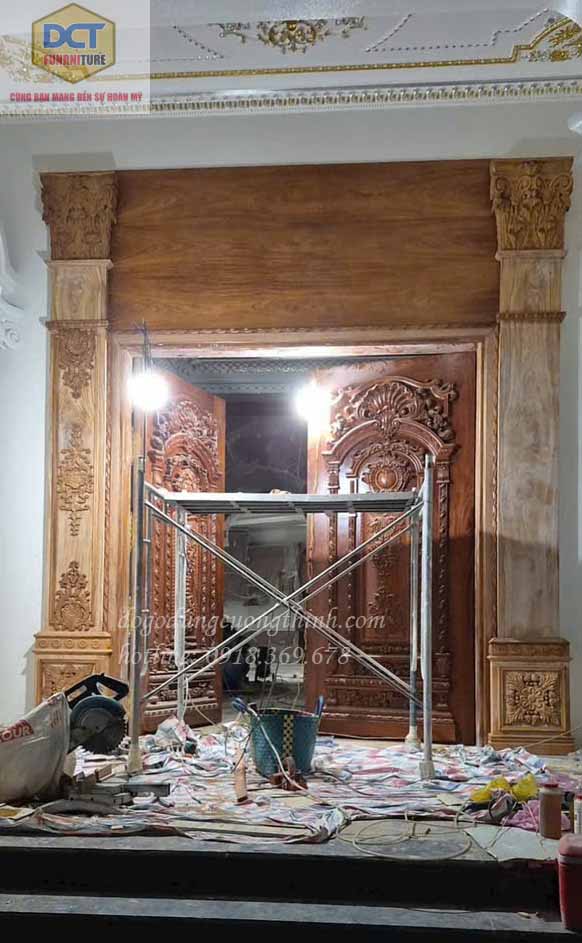 Bề mặt cánh cửa được chạm khắc thủ công tinh xảo, hoa văn đối xứng, đường nét uốn lượn mềm mại, tôn lên vẻ uy nghi và sang trọng cho toàn bộ mặt tiền. Các phần ốp cột và phào chỉ nóc được thiết kế đồng bộ, hòa quyện cùng tổng thể kiến trúc, tạo nên khung viền nổi bật như một bức tranh gỗ sống động.