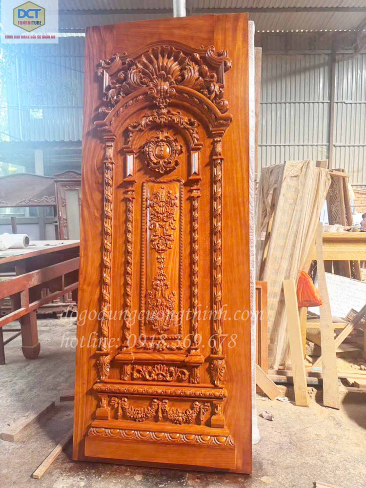 Cánh cửa dày dặn, bề thế, được gia công hoàn toàn từ gỗ gõ đỏ nguyên khối, nổi bật với vân gỗ tự nhiên mịn, màu sắc trầm ấm, sang trọng. Bề mặt được xử lý phẳng mịn, chống cong vênh, nứt nẻ – đảm bảo độ bền và vẻ đẹp trường tồn theo thời gian.