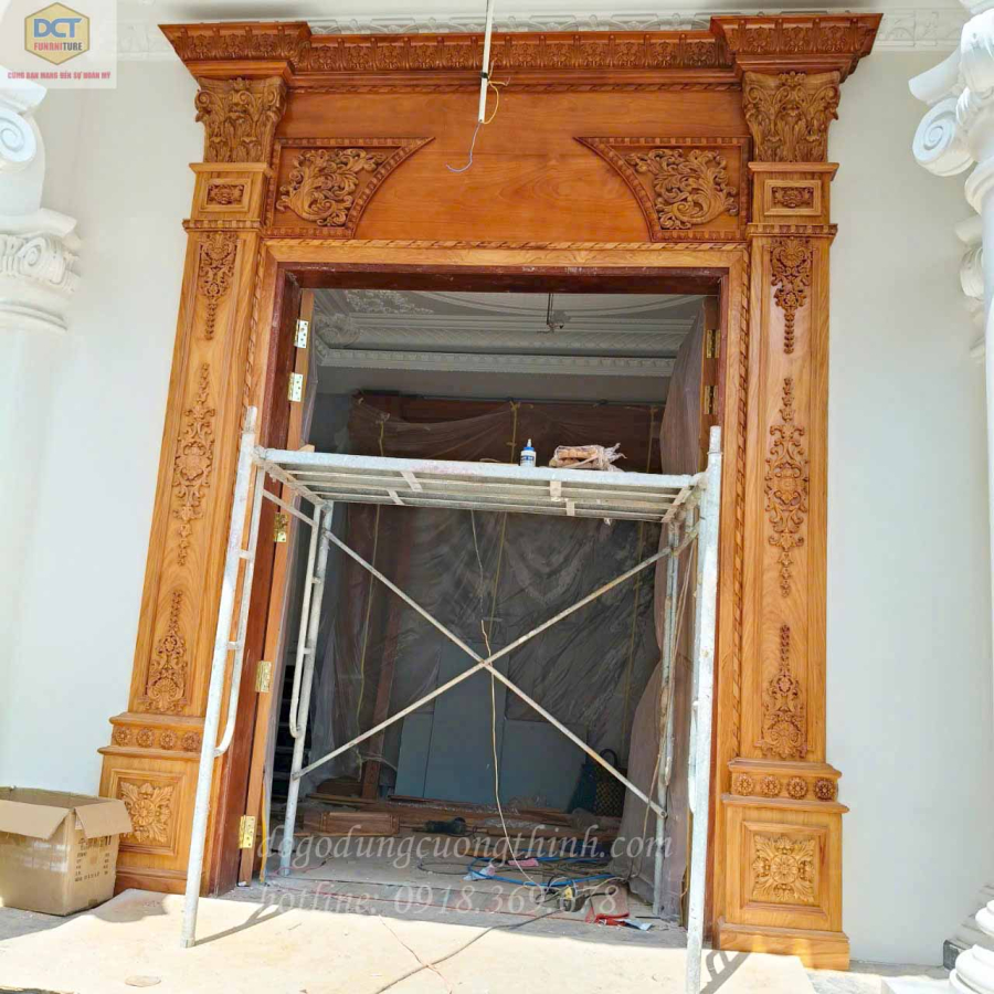 Bề mặt cánh cửa được chạm khắc thủ công tinh xảo, hoa văn đối xứng, đường nét uốn lượn mềm mại, tôn lên vẻ uy nghi và sang trọng cho toàn bộ mặt tiền. Các phần ốp cột và phào chỉ nóc được thiết kế đồng bộ, hòa quyện cùng tổng thể kiến trúc, tạo nên khung viền nổi bật như một bức tranh gỗ sống động.